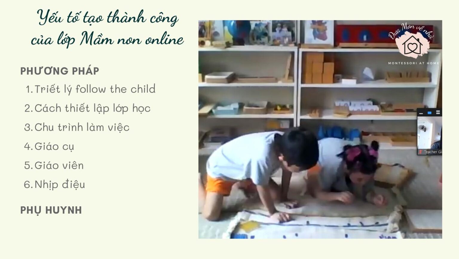 Bước vào một lớp học Montessori bạn sẽ thường thấy hình ảnh trẻ làm việc của mình, cô giáo ngồi