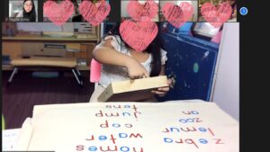 - Kael đang free và cô Giang chớp cơ hội để hướng dẫn Kael bài Fetching game. Nhưng khi vào breaking out room, Kael mặt buồn rầu bảo: “con không muốn làm việc đâu”. Ô hay, vừa mới ý kiến I want a work xong cơ mà vào đây là đổi ý là sao? Ok, không muốn thì tất nhiên là không làm rồi. Ok Kael, let’s back to the main room and I will wait till you are ready.