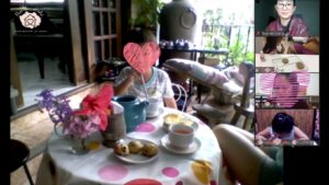 Rồi trẻ nhởn nha thưởng thức, trò chuyện với bố mẹ. Có gia đình có cả bố và mẹ tham gia, có gia đình con đóng bộ – bố quần đùi thưởng thức trà bánh, có gia đình bé ở nhà cùng người trông trẻ …. Cuối buổi, các cô ướm hỏi các con xem con có muốn mời bạn nào đó dùng tiệc trà cùng con không, và sau đó, một phòng break room được tạo ra dành riêng cho những bạn muốn mời nhau, đàm đạo vài câu chuyện. Tôi có thử join vào một phòng break như vậy để xem các bạn làm gì trong đó. Nhưng dù tắt camera tôi vẫn bị các bạn phát hiện ngay khi join vào. Vì không muốn làm ảnh hưởng đến sự tự do nói chuyện của những người lớn ít tuổi này, tôi vội xin lỗi và out ra ngoài.
